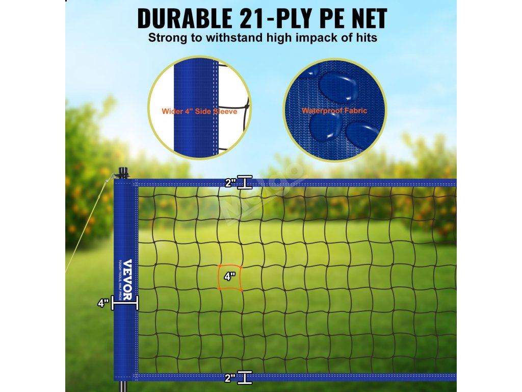 Tato síť vyrobená z pružného 21vrstvého PE materiálu zaručuje výjimečnou odolnost a delší životnost. Její širší 4palcová konstrukce bočních rukávů a nepromokavá tkanina jsou ideální pro venkovní použití a jsou schopny odolat silným nárazům během intenzivních zápasů.