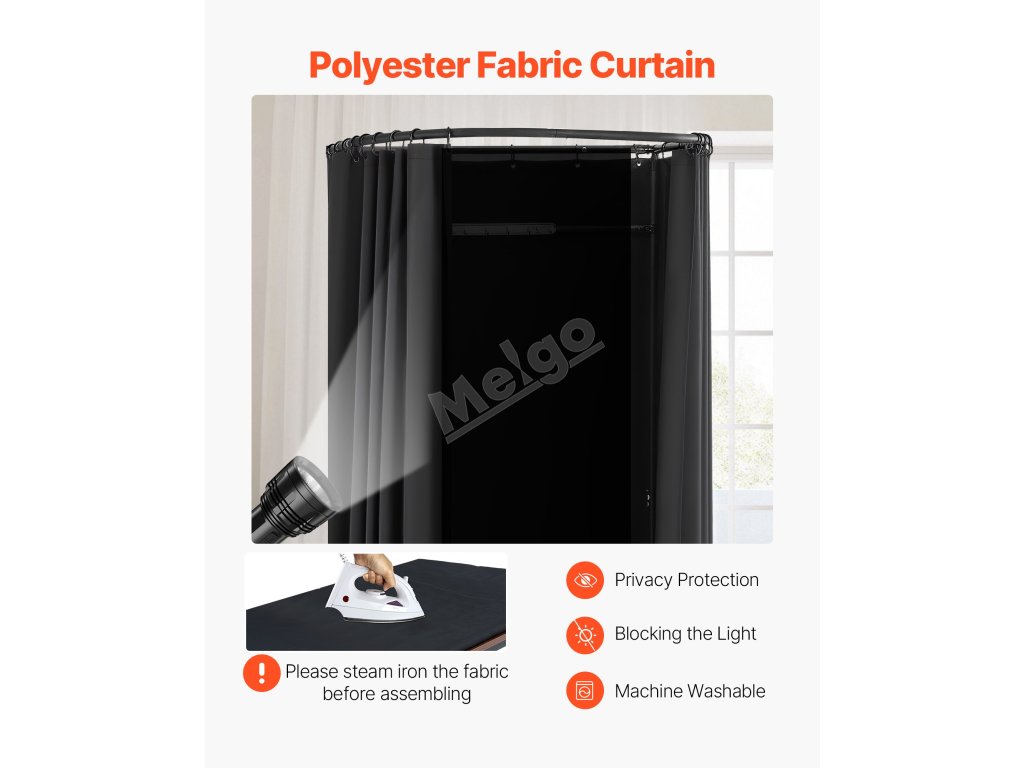 Je vyroben z polyesterové tkaniny, která blokuje světlo, zajišťuje soukromí a je odolná proti pomačkání. Robustní železný rám zajišťuje stabilitu a poskytuje bezpečný prostor pro převlékání, ideální pro obchodní centra, butiky, studia, obchody se svatebními šaty a další.