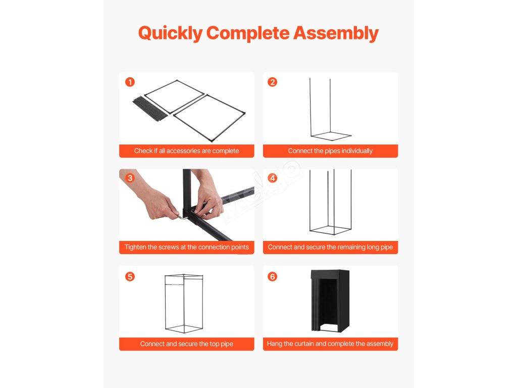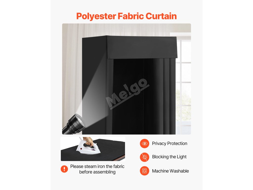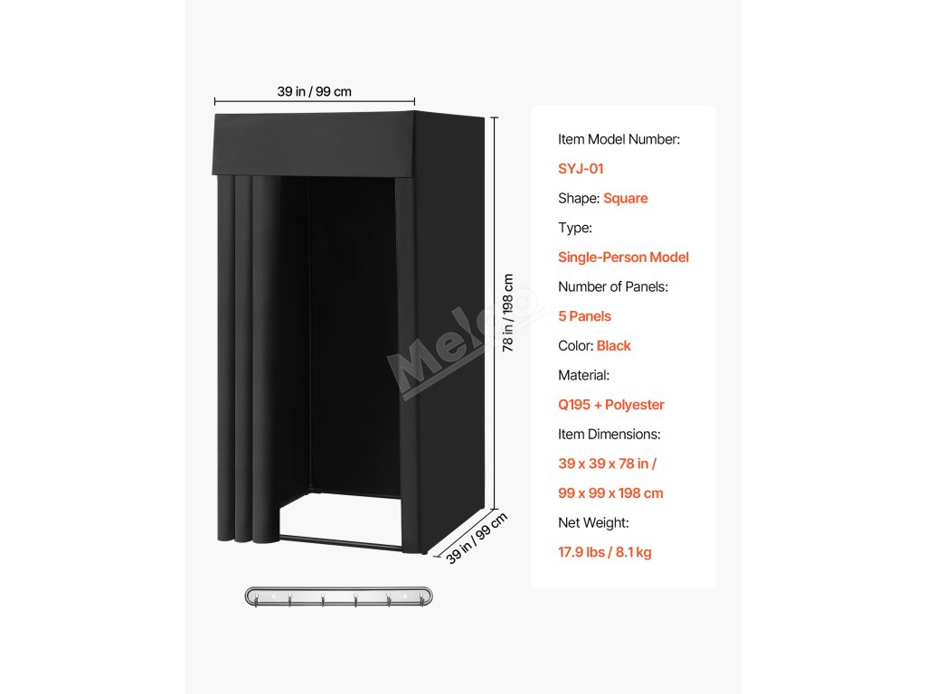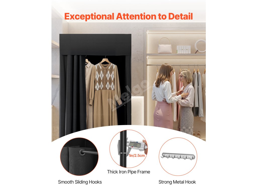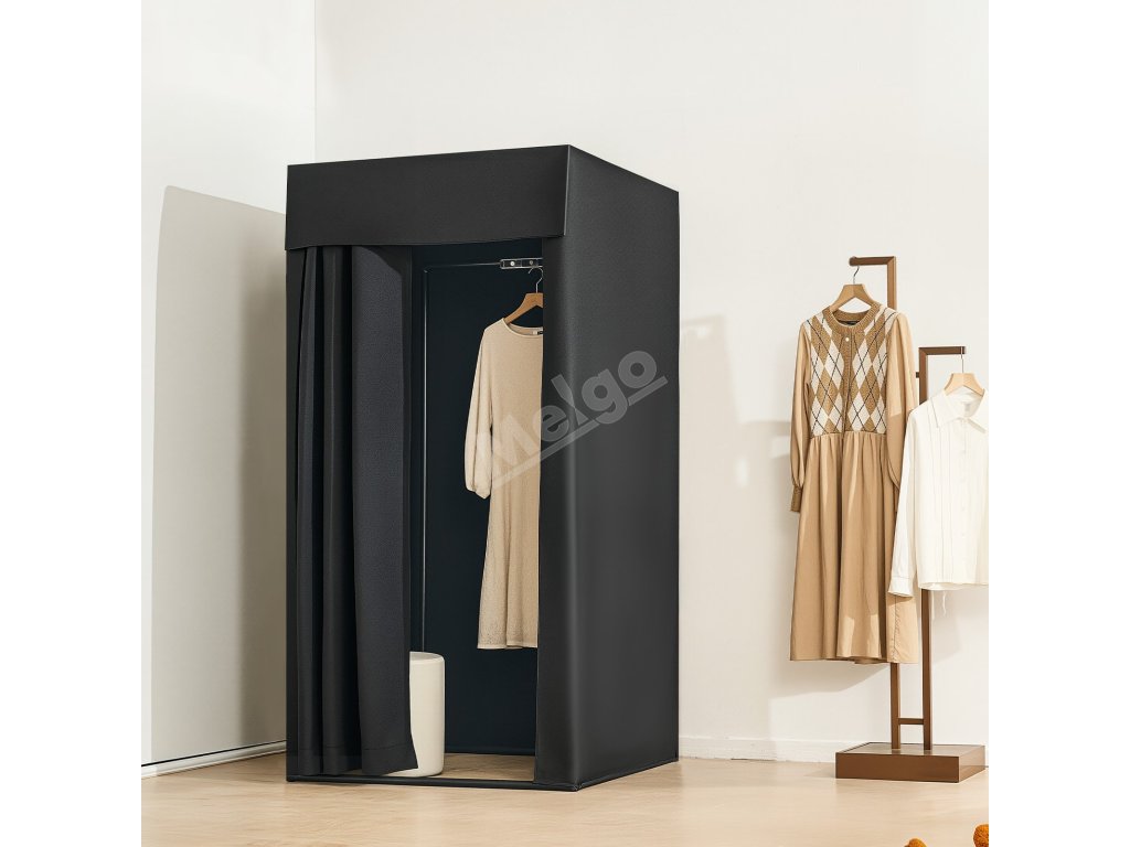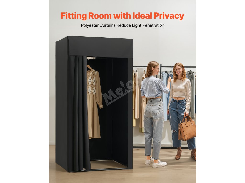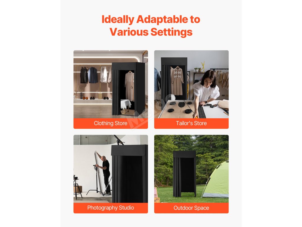 Je vyroben z polyesterové tkaniny, která blokuje světlo, zajišťuje soukromí a je odolná proti pomačkání. Robustní železný rám zajišťuje stabilitu a poskytuje bezpečný prostor pro převlékání, ideální pro obchodní centra, butiky, studia, obchody se svatebními šaty a další.