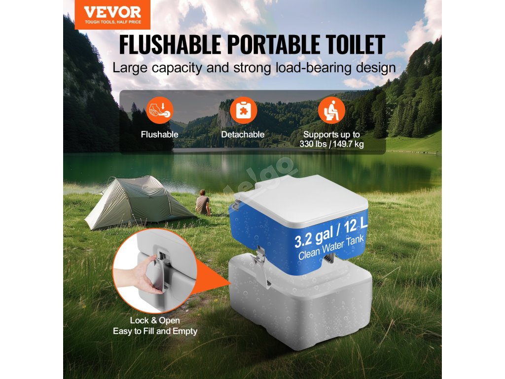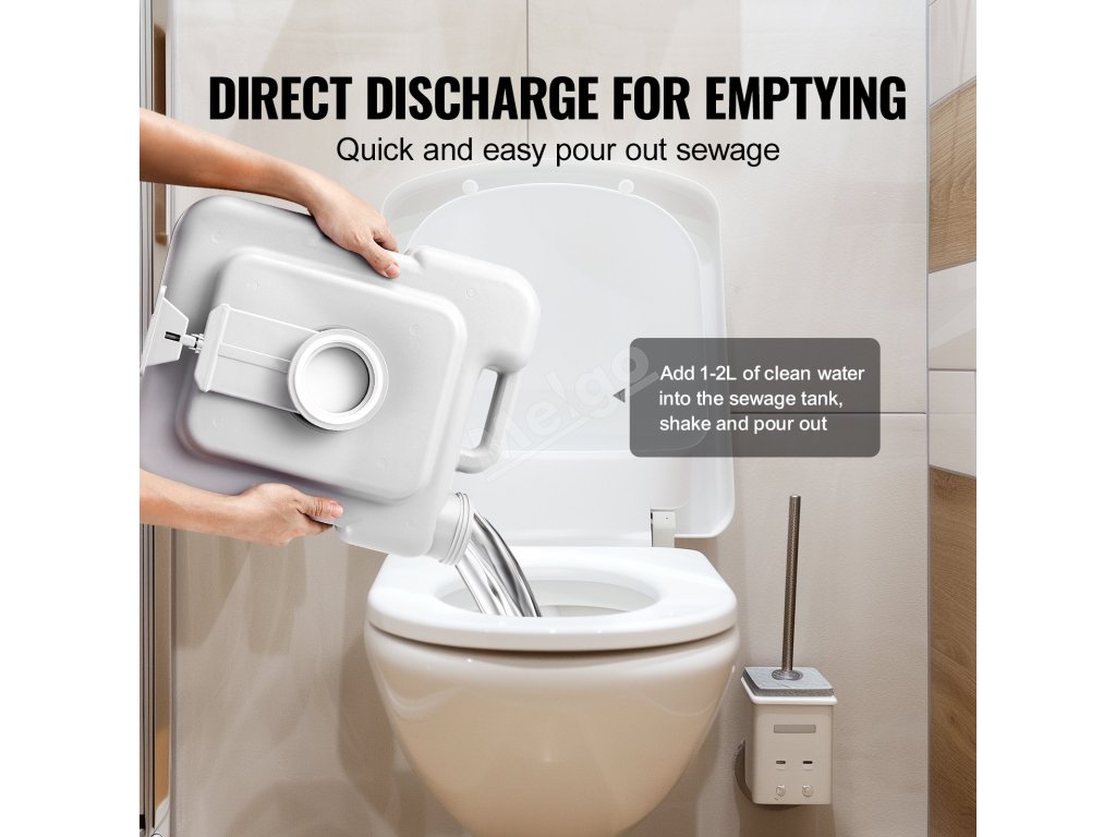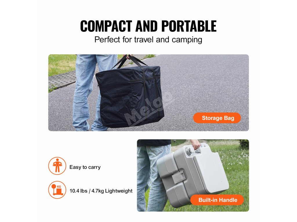 Přenosná toaleta má velkou kapacitu odpadní nádrže 5,3 gal/20 l s funkcí splachování, ideální pro cestování na dlouhé vzdálenosti, vhodná pro použití v karavanech, lodích, nákladních vozidlech, při kempování v přírodě, na cestách atd.