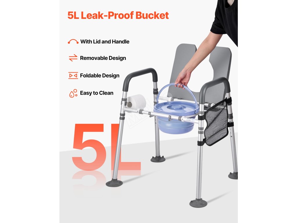 Naše nočníková židle pro dospělé obsahuje odnímatelný 5l kbelík s víkem, který zabraňuje úniku vody a zápachu. Lze jej snadno oddělit a vyčistit, čímž se komoda udržuje svěží a hygienická.