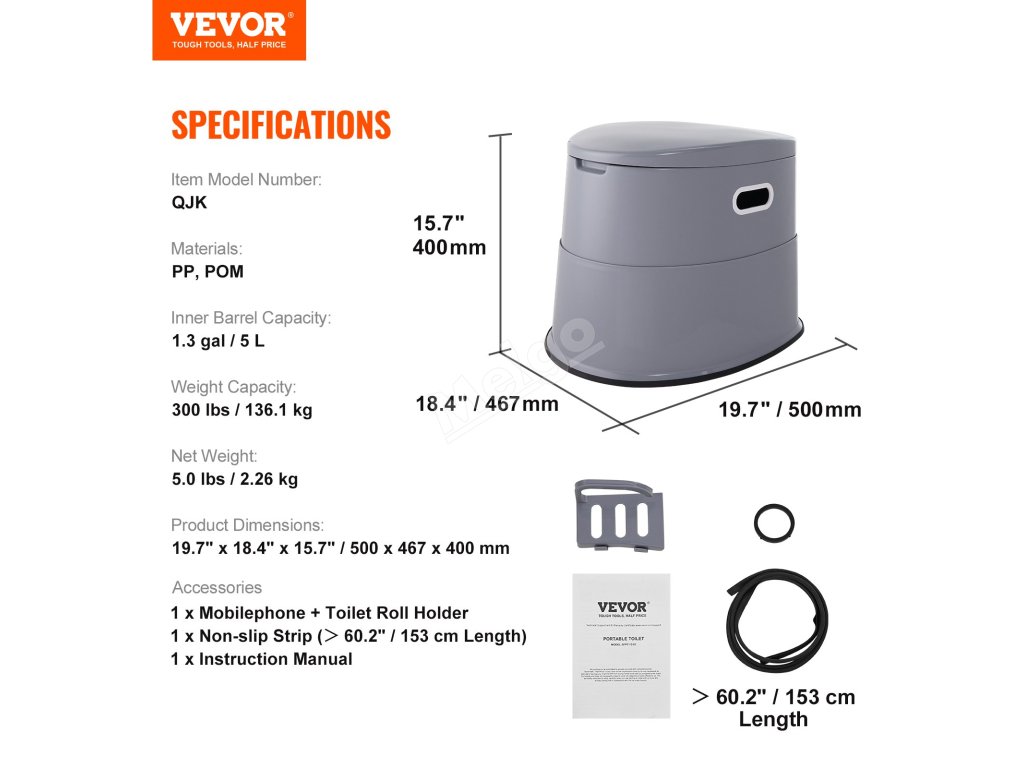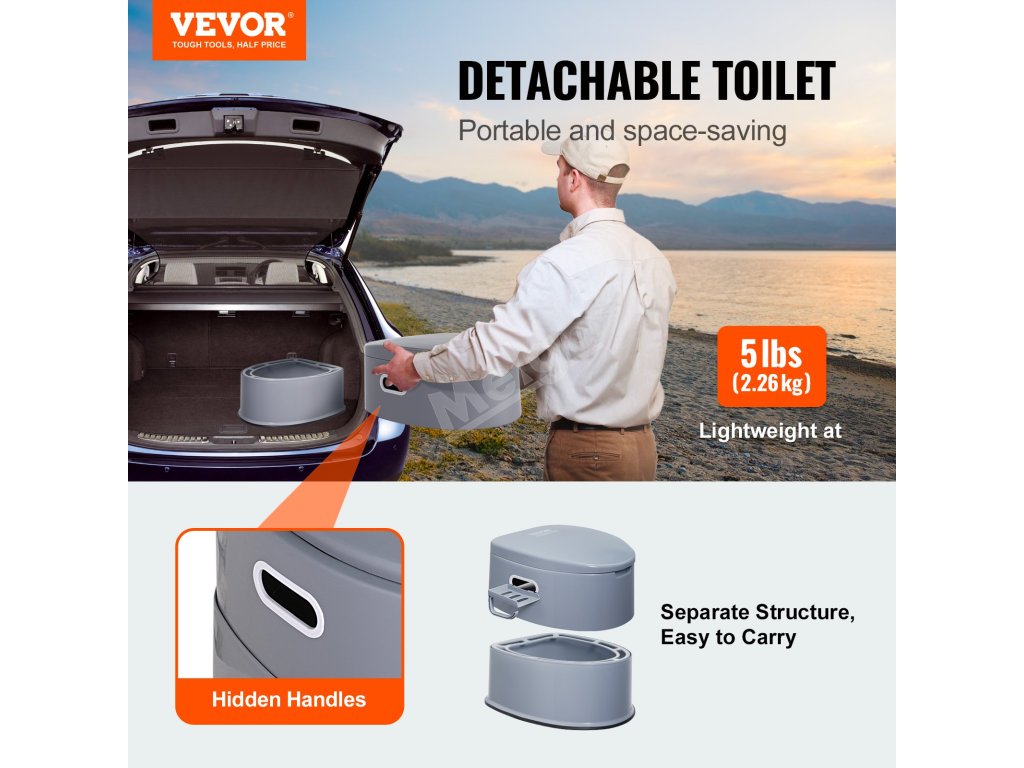 Tato přenosná toaleta je lehká a pohodlně se přenáší. Díky velkému vnitřnímu vědru o objemu 1,3 galonu (5 l), které lze odpojit, ji lze snadno naložit do cestovního kufru. Dejte sbohem shonu při hledání veřejných toalet na cestách!