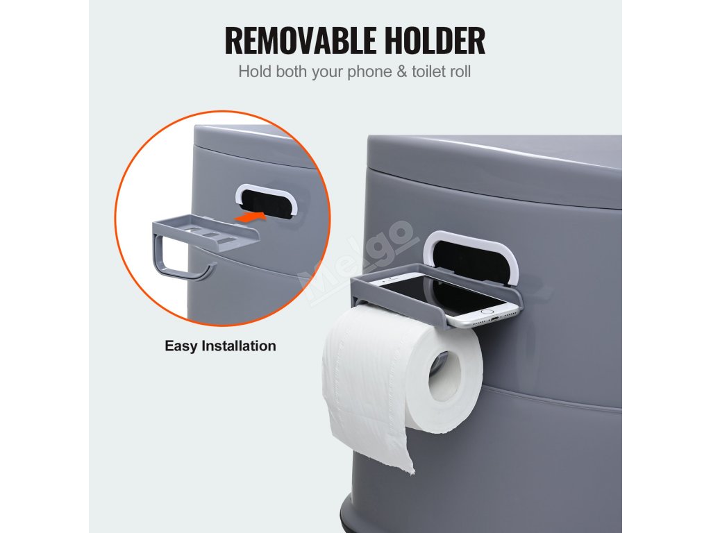 Mějte svůj telefon a toaletní papír v bezpečí a na dosah! Tento přenosný nočník obsahuje odnímatelnou poličku na telefon a držák na papír připevněný k libovolnému madlu na boku, který poskytuje bezpečné místo pro váš telefon a toaletní papír.