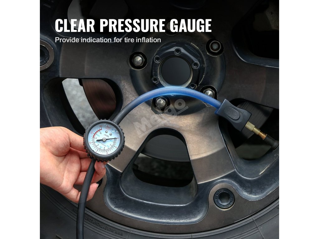 Poskytujeme vám 6,5ft napájecí kabel a 26ft gumovou vzduchovou hadici, takže můžete snadno zvládnout i práce na dlouhé vzdálenosti. Vzduchová hadice je také vybavena mechanickým tlakoměrem, který zajišťuje monitorování tlaku v reálném čase, takže můžete kdykoli sledovat tlak vzduchu.