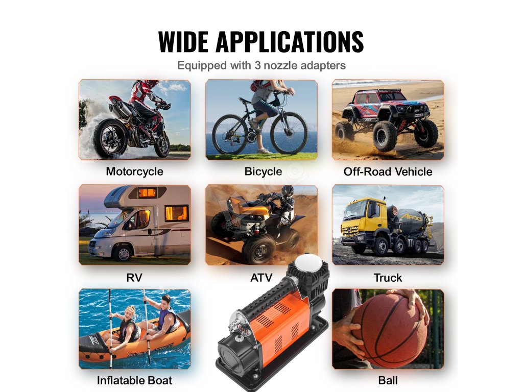 Tato přenosná 12voltová hustilka pneumatik vybavená 3 adaptéry s tryskami je univerzální pro různá vozidla včetně osobních automobilů, SUV, nákladních automobilů, dodávek a obytných vozů. Je také určena pro motocykly, jízdní kola, míče a další rekreační zařízení, jako jsou nafukovací hračky a čluny.