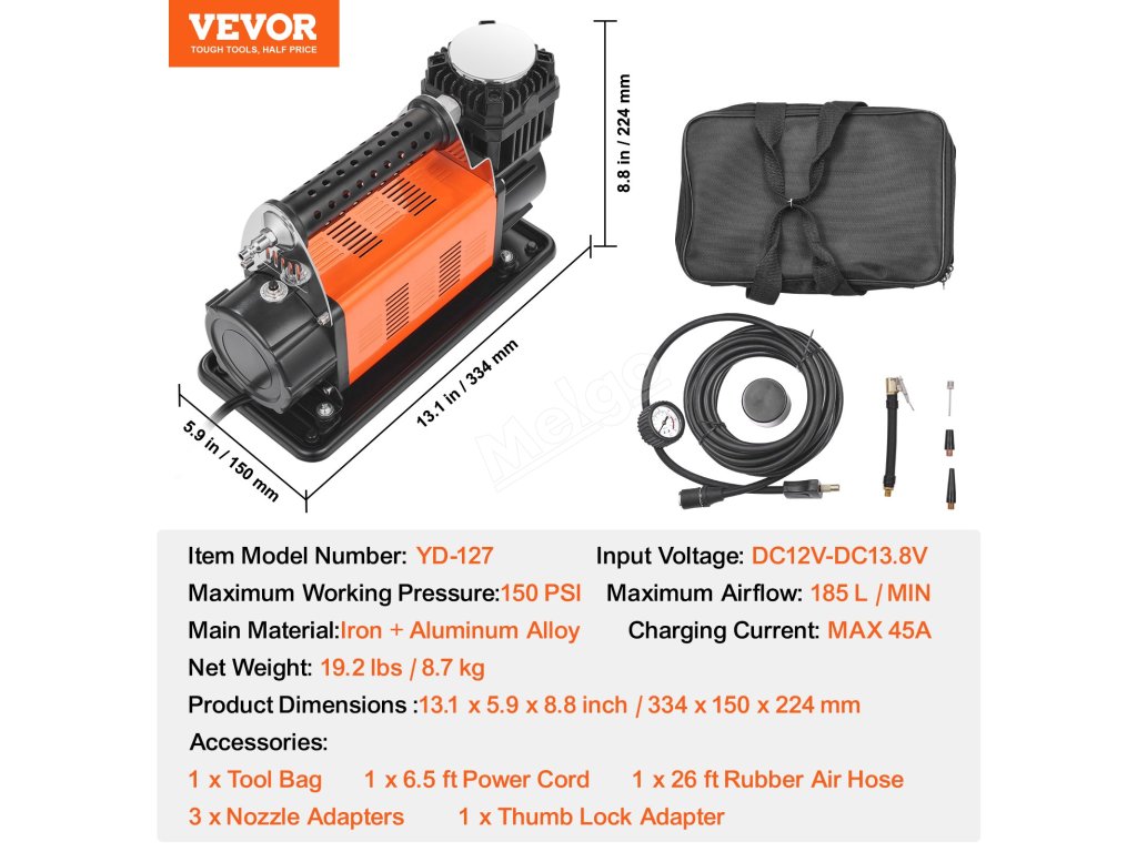 Buďte připraveni s přenosným kompresorem VEVOR 12 V - spolehlivým společníkem pro bezproblémové nafukování kdykoli a kdekoli. S maximálním tlakem 150 PSI a rychlým průtokem vzduchu 7,06 CFM vás tato přenosná hustilka pneumatik rychle vrátí na silnici a ušetří vám drahocenný čas.