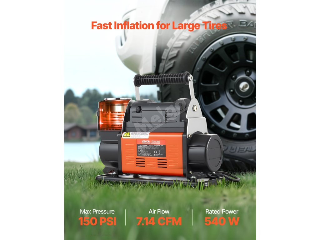 Tato přenosná hukovačka pneumatik je poháněna vysoce účinným 540W motorem a poskytuje maximální pracovní tlak až 150 PSI a průtok vzduchu 202 l/min. Účinně nafukuje pneumatiky osobních automobilů, SUV, nákladních automobilů, motocyklů a jízdních kol, stejně jako sportovní míče a rekreační vybavení.