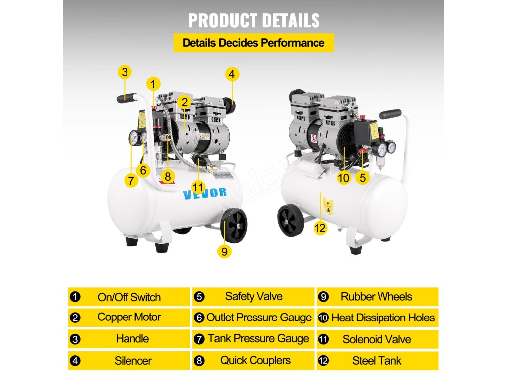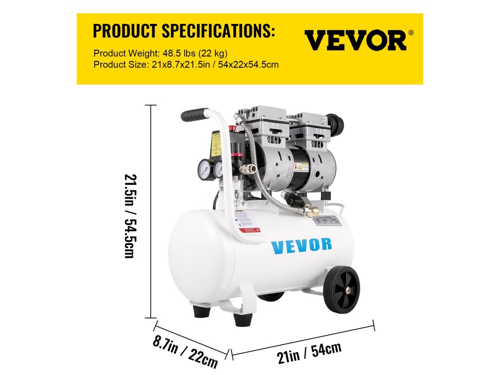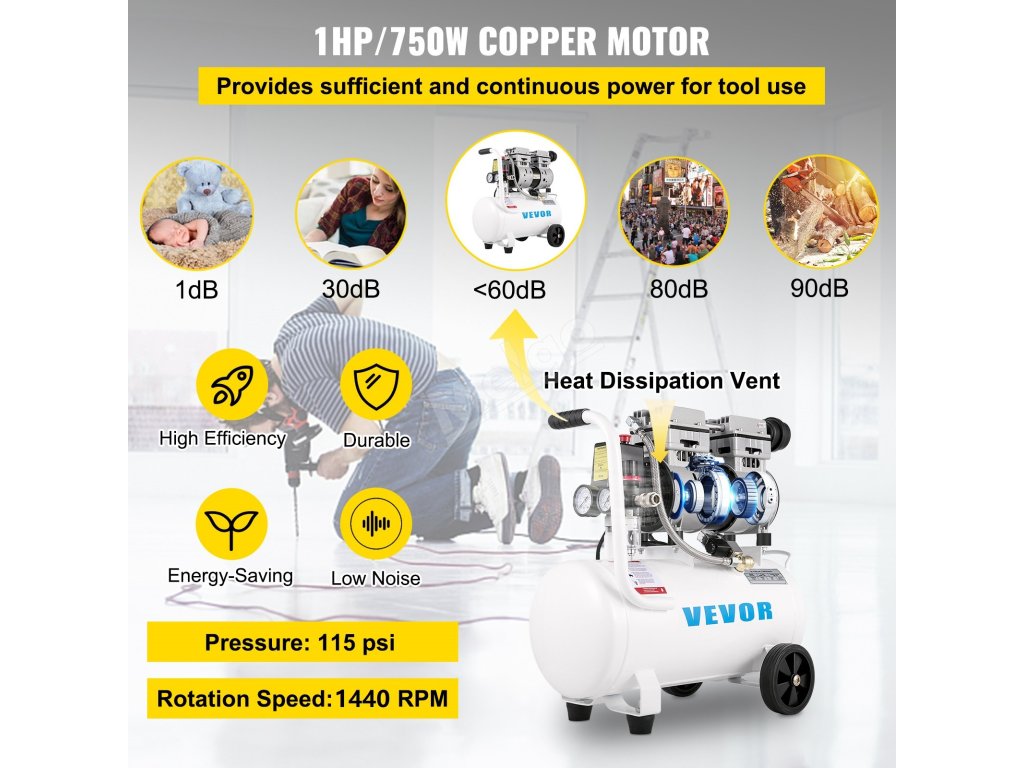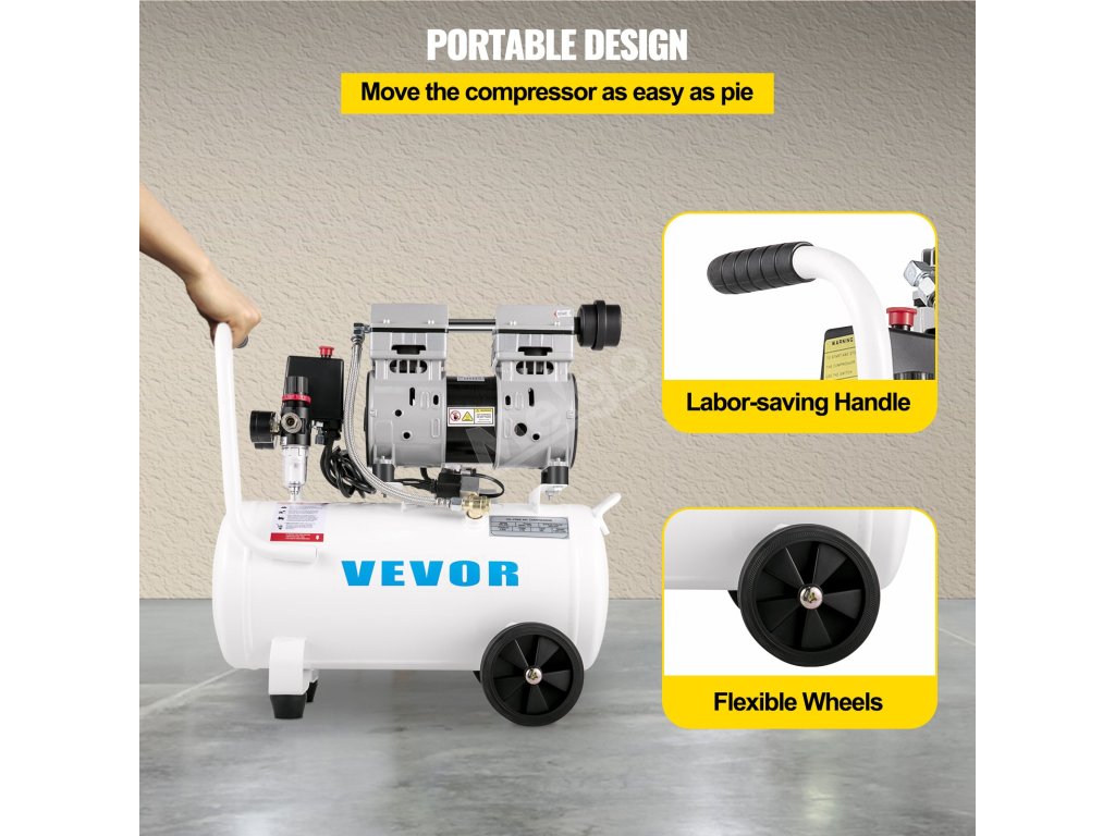 Přenosný bezolejový vzduchový kompresor 20.8 L, tichý, 1 HP, 115 PSI