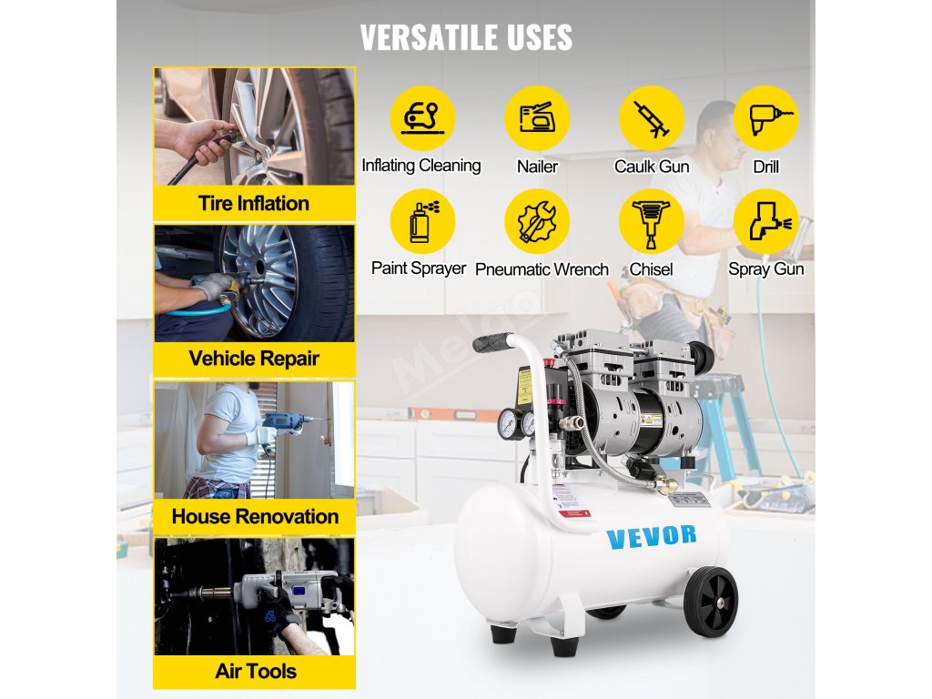 Tento vzduchový kompresor se široce používá k huštění pneumatik, opravám vozidel, renovaci domů atd. Kromě toho je vhodný pro vrtačky, hřebíkovačky, pneumatické klíče, stříkací pistole a další pneumatické nářadí.
