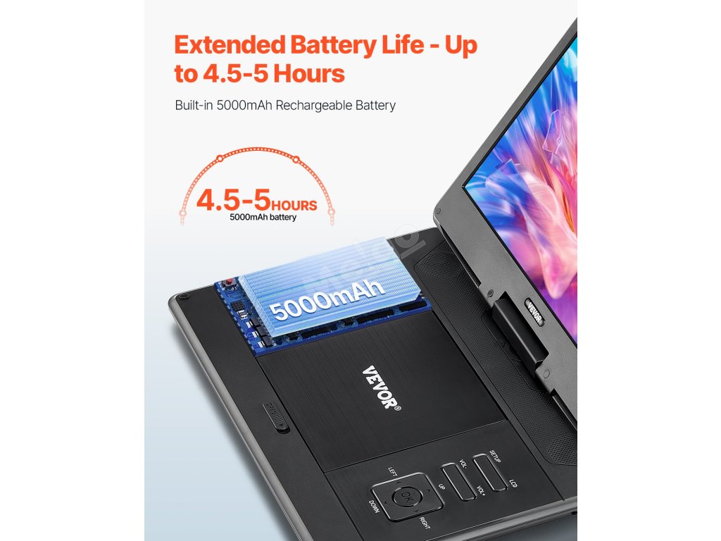 Přenosný přehrávač DVD s obrazovkou má vestavěnou baterii. Užijte si delší používání bez obav z vybití energie. Síťový adaptér je ideální pro domácí použití a nabíječka do auta umožňuje pohodlné cestování. Ať už na cesty nebo pro každodenní použití, je připraven bavit v jakémkoli prostředí.
