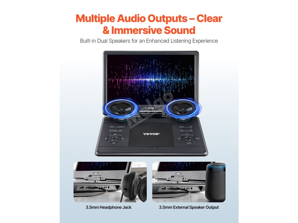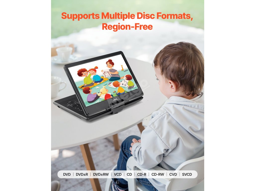 Tento cestovní přehrávač DVD je kompatibilní s disky všech regionů včetně DVD, DVD±R, DVD±RW, VCD, CD, CD-R, CD-RW, CVD a SVCD. Podporuje také karty USB a SD (až 32 GB, 1024 x 600 HD video) a formáty, jako jsou MPEG1, MPEG2, MPEG4 pro video, MP3, WMA pro audio a JPEG, JPG pro fotografie.