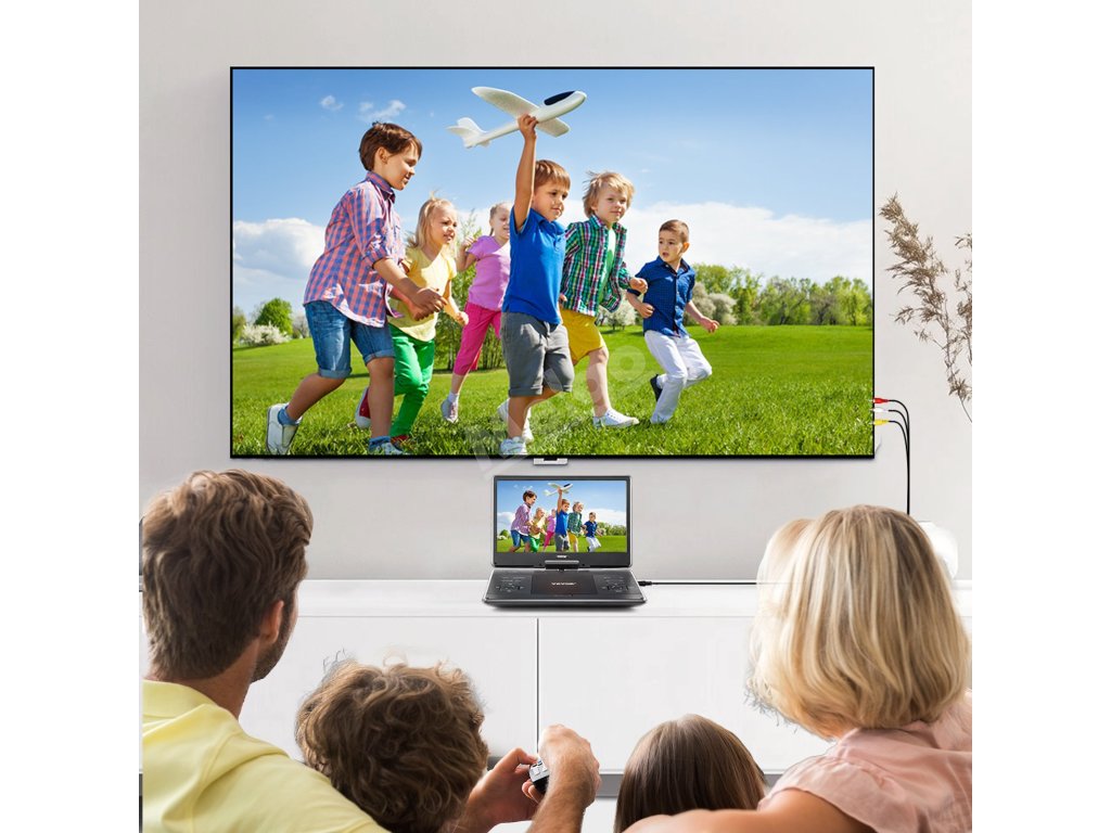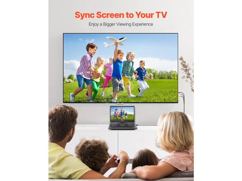 Díky výstupu AV můžete snadno synchronizovat obrazovku zařízení s jiným přehrávačem DVD stejného modelu, televizorem nebo projektorem pro společné sledování. Užijte si více zábavy s rodinou a přáteli díky zábavě na více obrazovkách.