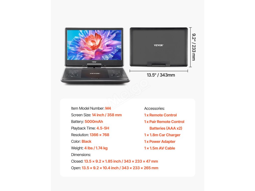 Přenosný dvd přehrávač 14 inch hd, 4,5–5 h, usb/sd, dálkové ovládání