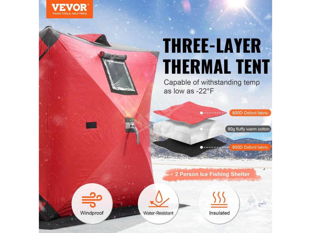 Tento rybářský přístřešek na led je určen pro 1 až 2 osoby. Jeho multifunkční využití vyhovuje vašim potřebám, ať už jde o venkovní rybaření pod ledem, zimní kempování, dočasný venkovní přístřešek nebo o zakrytí a ochranu vašeho vybavení v chladném počasí.