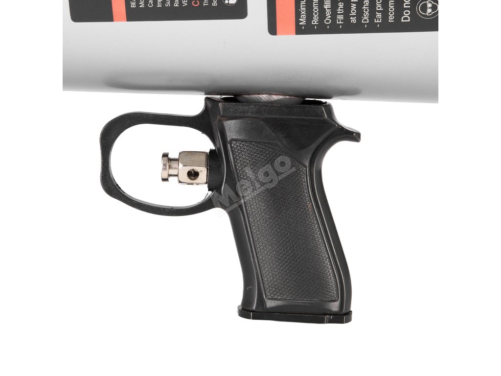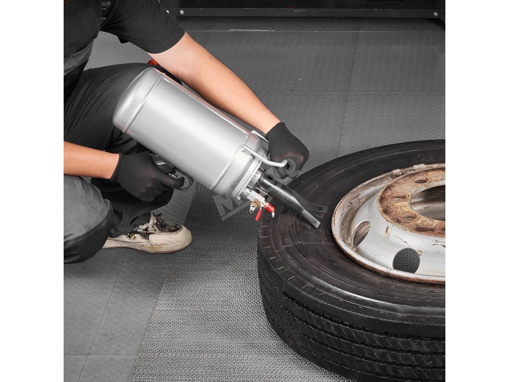 Láhev naplňte vzduchovým kompresorem na pracovní tlak. Umístěte pneumatiku do vodorovné a stabilní polohy, přitlačte trysku k okraji ráfku a spusťte výfuk. U malých pneumatik použijte protiskluzovou podložku, u velkých pneumatik použijte plošinu pro usazení patky.