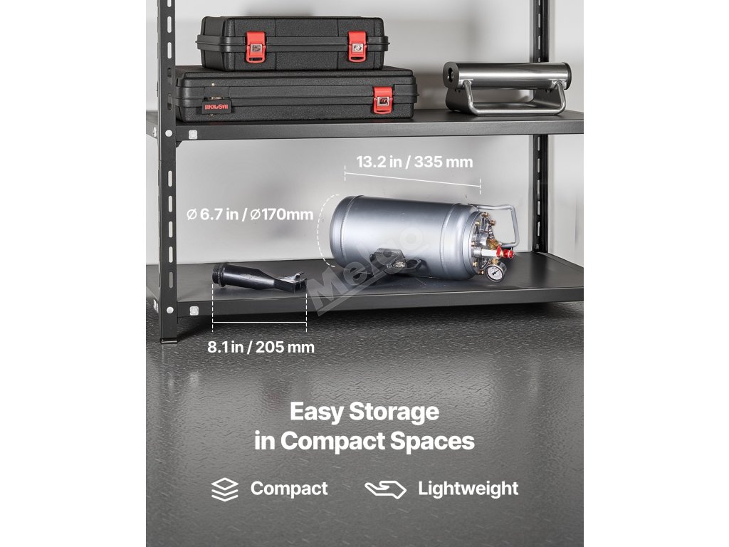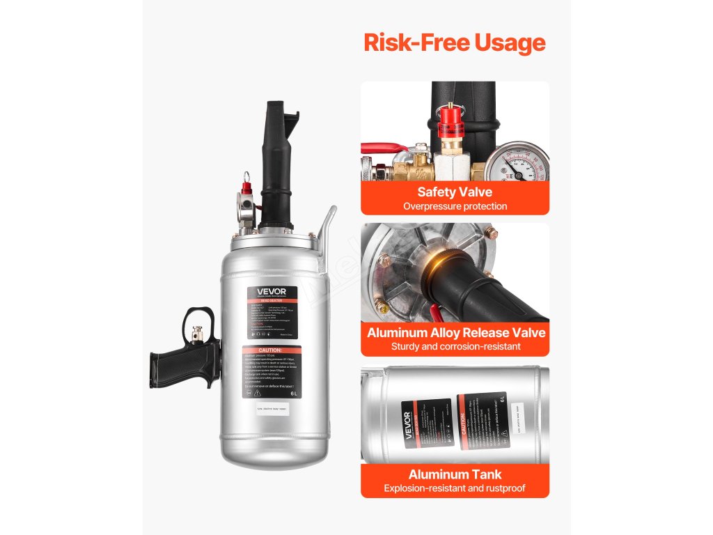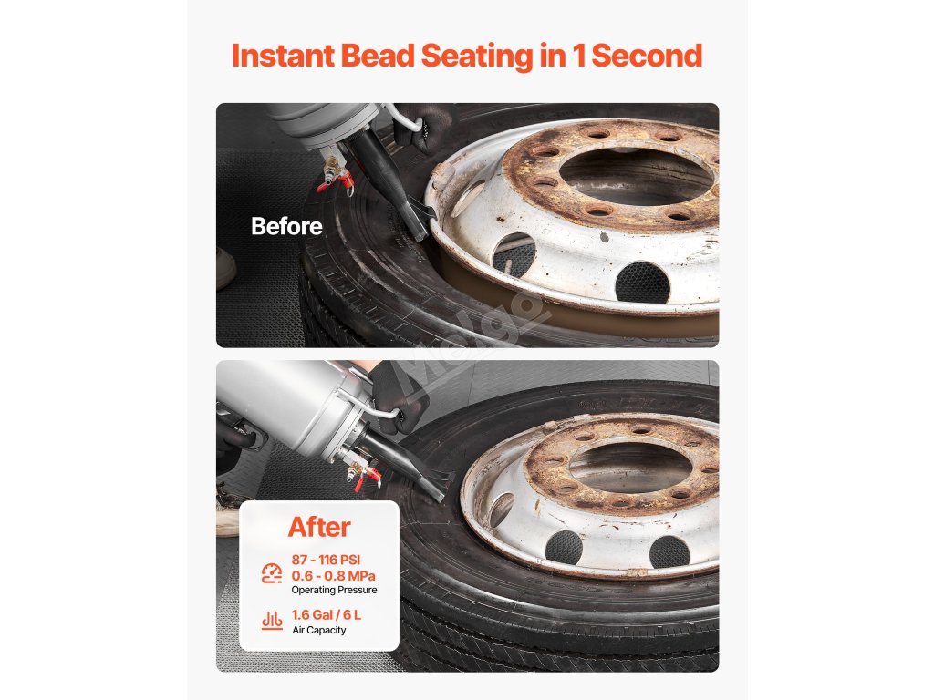 1.hustilka o objemu 6 gal/6 l rychle uvolňuje vysokotlaký vzduch, který za pouhou 1 sekundu usadí patku pneumatiky do správné polohy, takže huštění pneumatik je bezproblémové a šetří práci.