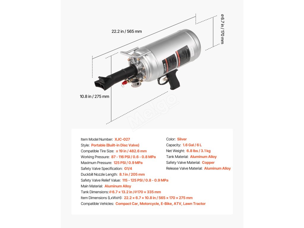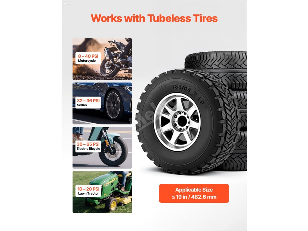 Podporuje bezdušové pneumatiky o průměru ≤ 19 palců / 482,6 mm včetně malých automobilů, motocyklů, elektrokol, čtyřkolek a sekaček na trávu. Provozní tlak: 87-116 PSI / 0,6-0,8 MPa. Hustotu vzduchu nastavte podle velikosti pneumatiky.