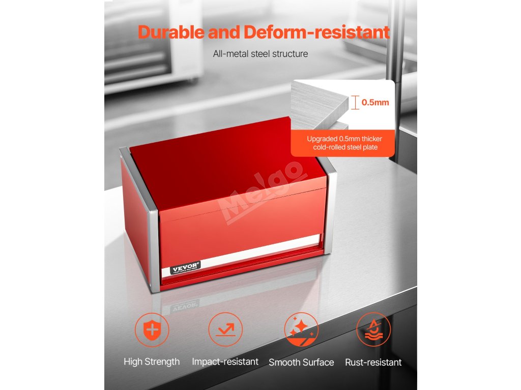 Ocelový box na nářadí má magnetický horní kryt pro snadné otevírání a zavírání. Po zavření zůstávají zásuvky bezpečně na svém místě, což usnadňuje přemístění boxu na nářadí na různá místa.
