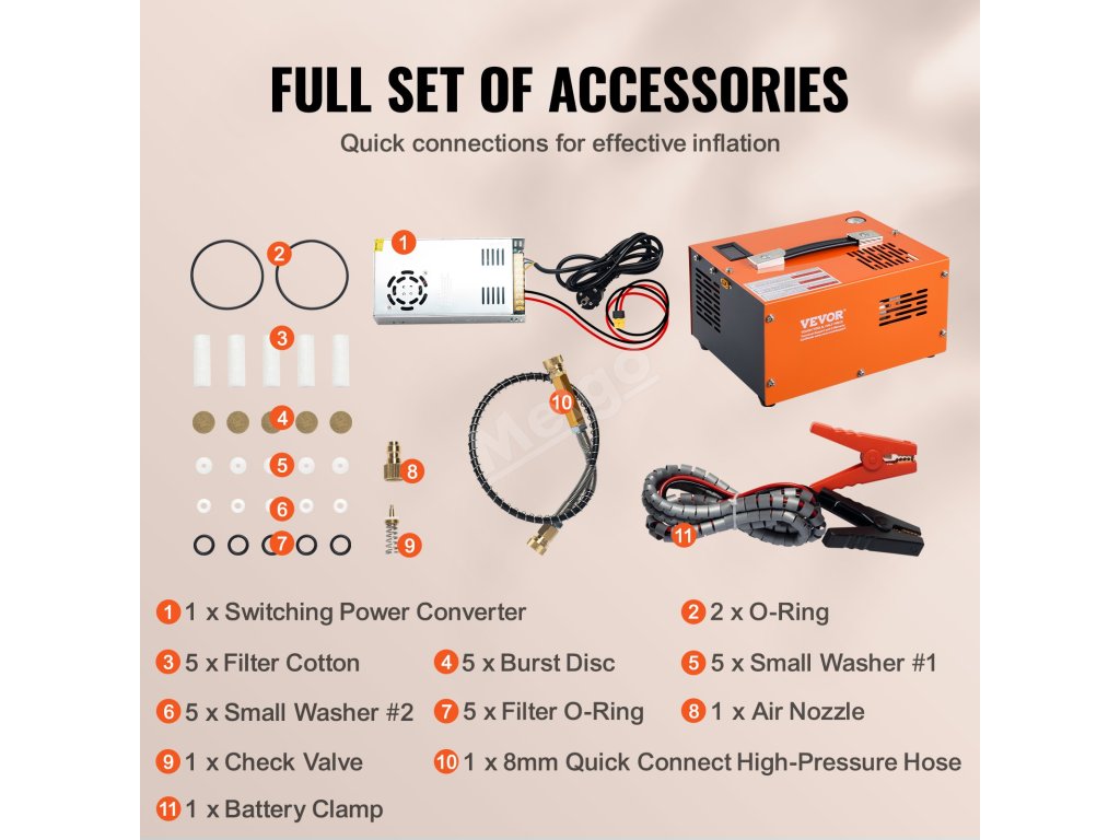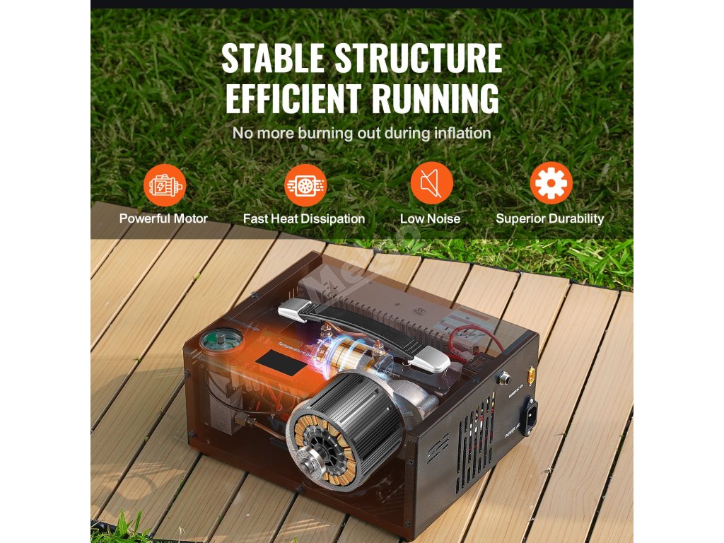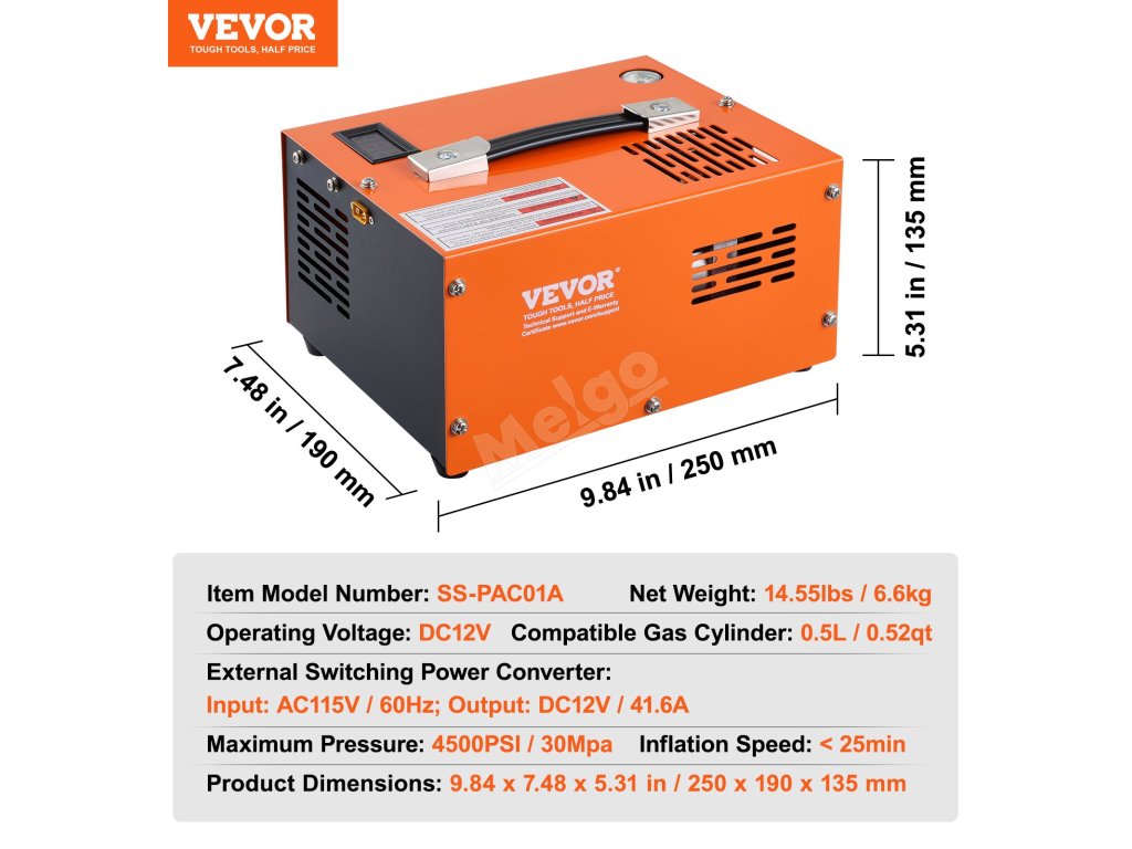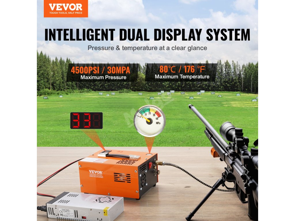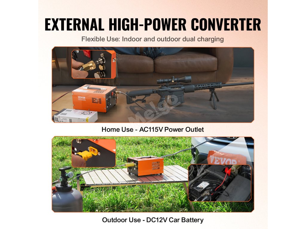Vzduchový kompresor VEVOR PCP: neomezená dodávka vzduchu kdykoli a kdekoli! Díky 500W externímu měniči s vysokým výkonem poskytuje možnost duálního nabíjení DC12V a AC230V. Užijte si bezproblémové a rychlé nafukování s kompresorem VEVOR: maximální tlak 4500 PSI/30 MPa a zobrazení teploty a tlaku v reálném čase.