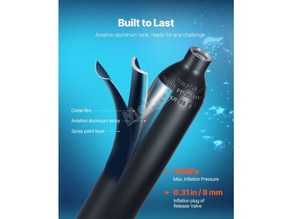 Tato potápěčská nádrž je vyrobena z hliníkové slitiny letecké kvality, je odolná vůči vysokému tlaku a korozi, takže vám poskytne jistotu při každém ponoru v různých podvodních podmínkách.