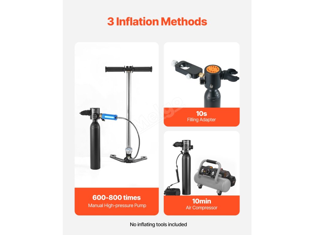 Tato sada 0,5l mini potápěčské nádrže poskytuje 5 až 10 minut potápění, což je ideální pro začátečníky a rekreační potápěče. Je to skvělý úvod do světa pod vlnami!