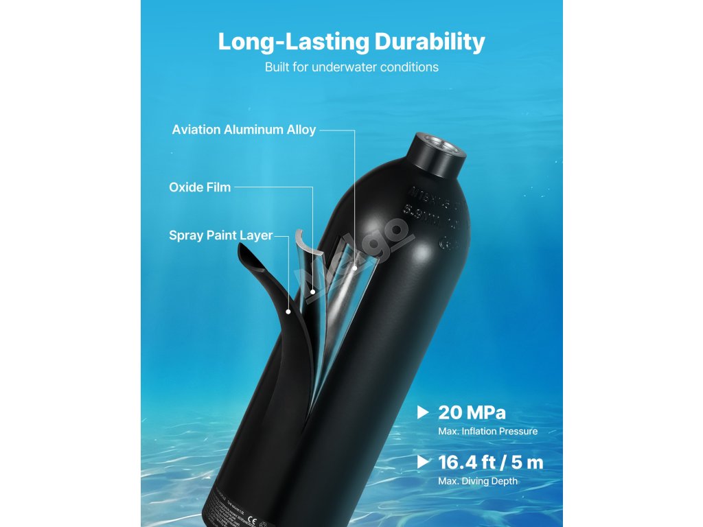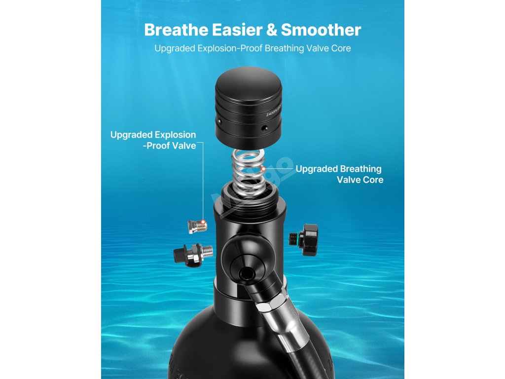 Naše velkokapacitní potápěčská láhev o objemu 1 litr poskytuje spolehlivou dodávku vzduchu až na 15-20 minut. Je lehká a účinná, ideální pro krátké ponory, šnorchlování a nouzové dýchání, takže vám umožní užít si flexibilní podvodní dobrodružství.