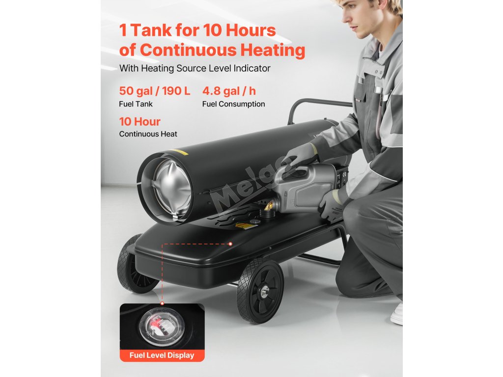 Tento petrolejový ohřívač poskytuje stálé teplo pro velké plochy, od skladů a továren až po farmy a stavební zóny, a je ideální pro každodenní nebo sezónní práce.