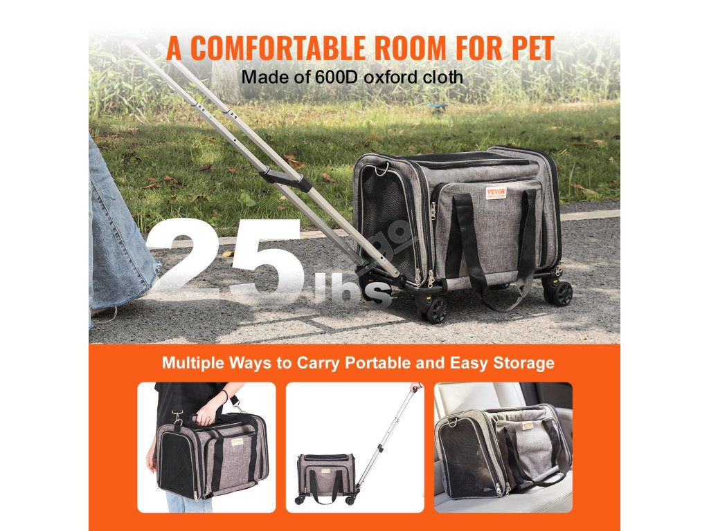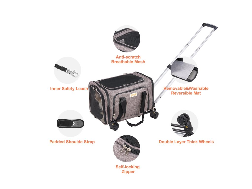 Tato přepravka schválená leteckou společností poskytuje vašemu domácímu mazlíčkovi bezpečný a pohodlný prostor pro cestování. Je vyrobena z odolné tkaniny 600D Oxford a má silnou nosnost. Díky dvouvrstvým odolným kolečkům se snadno tlačí a táhne. díky 3 možnostem přenášení je přenosná a pohodlně se skladuje.