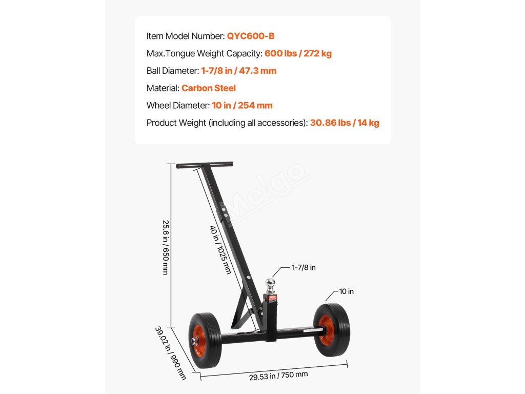 Přesouvač přívěsu 600lbs, ocel, závěs 1-7/8 in, 10 in plná kola