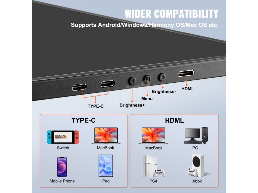 Kompatibilní s různými zařízeními včetně systémů Android, Windows, Harmony OS a MAC OS. Každá obrazovka se připojuje pomocí jediného kabelu Type-C nebo HDMI+USB, takže nastavení je rychlé a snadné.