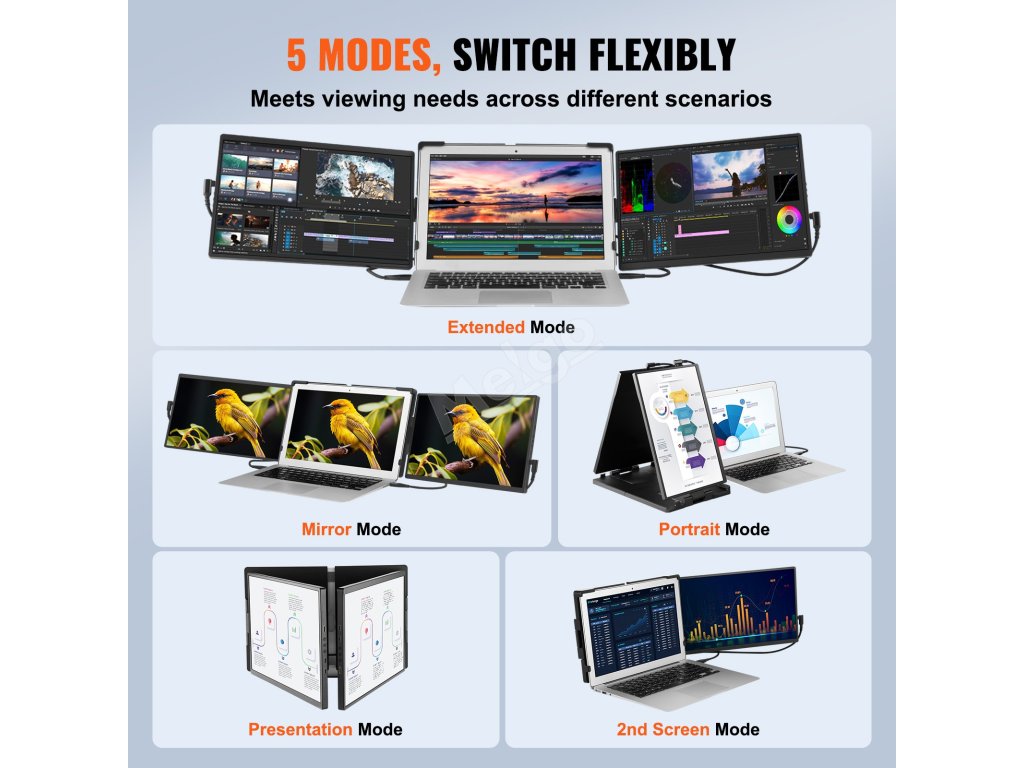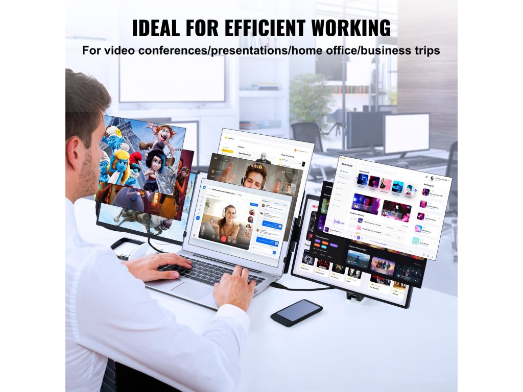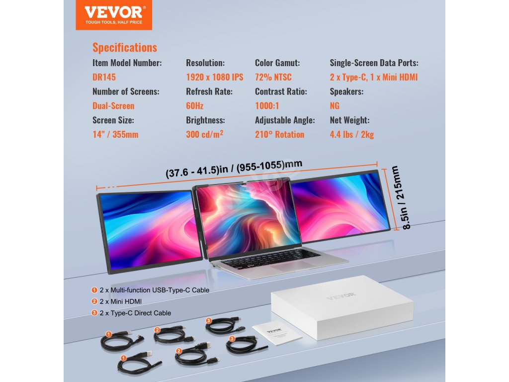 Obsahuje veškeré potřebné příslušenství: 2 kabely mini HDMI, 2 multifunkční kabely USB typu C a 2 kabely pro přímé připojení typu C. Monitor VEVOR pro obrazovku notebooku váží pouhých 4,4 kg a zaručuje efektivní práci kdekoli.