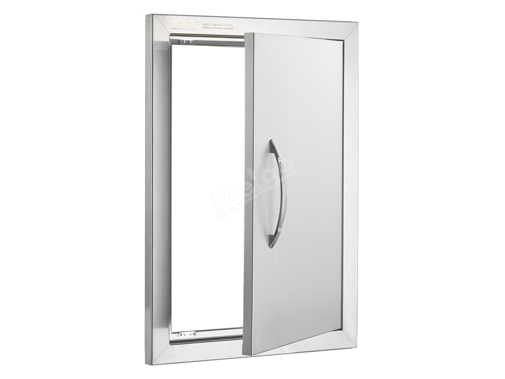 Dvířka venkovní kuchyně jsou vybavena ergonomickou rukojetí pro snadné otevírání. Hrany rámu dvířek jsou ohnuté a zesílené. Odnímatelná konstrukce dvířek umožňující vyjmutí závěsu, a tím změnu směru otevírání dvířek. Směr můžete nastavit podle svých zvyklostí při používání.
