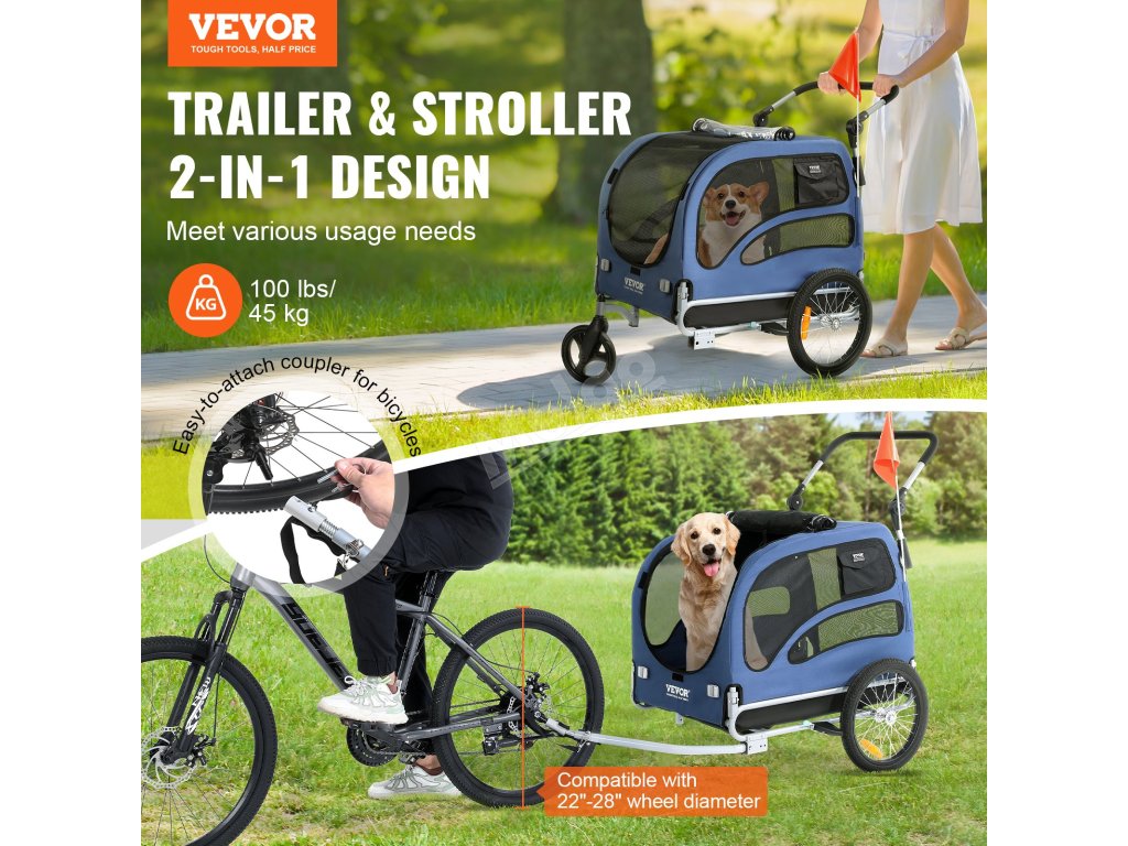Přívěs pro psa na kolo 2v1, nosnost 100 lbs, skládací rám, reflektor