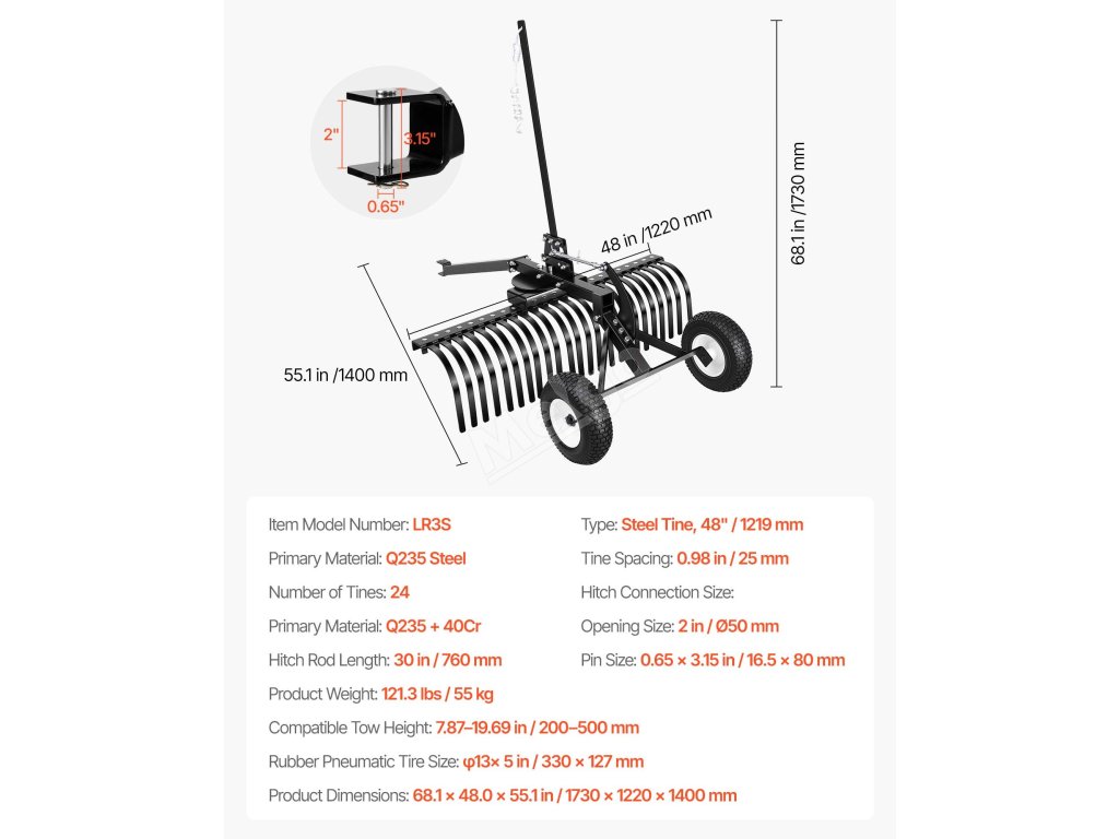 Přívěsný hrabák 122 cm, 24 ocelových zubů, nastavitelná výška