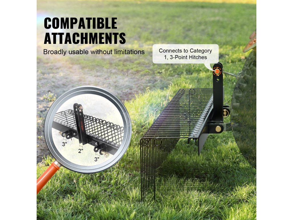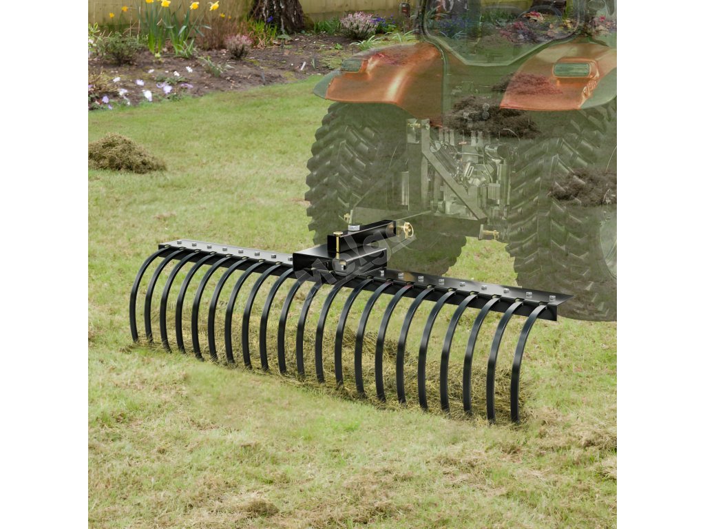 Tažné hrábě na trávu lze používat s 48palcovými nebo 60palcovými lištami na nářadí a tříbodovým systémem zavěšení.