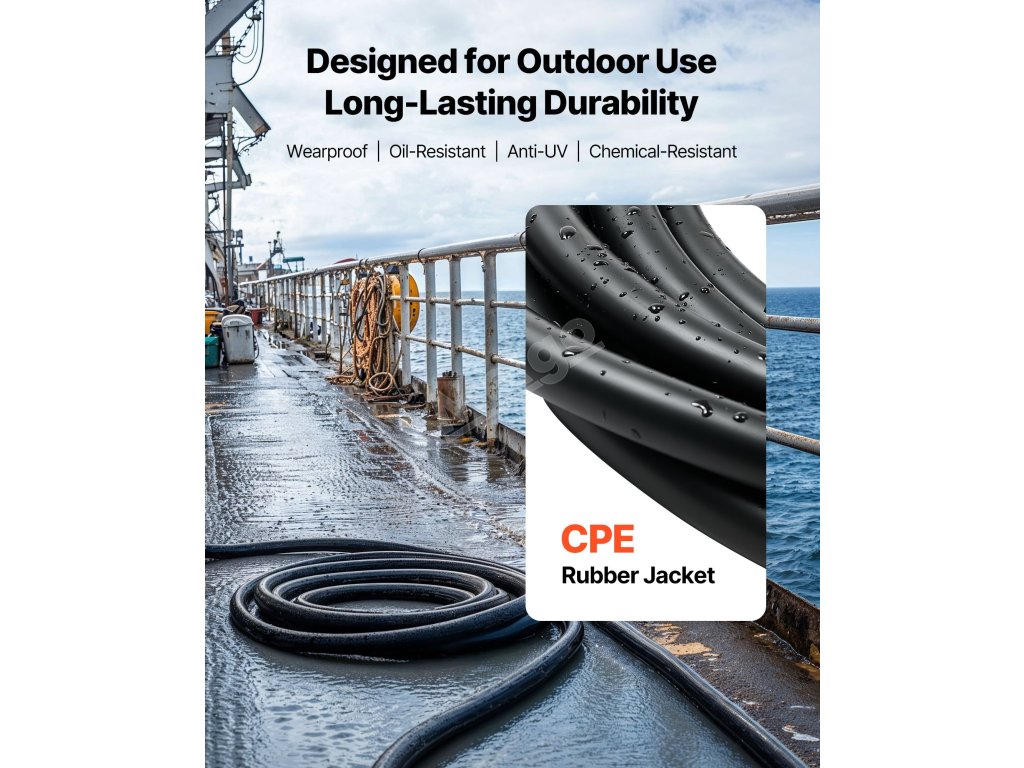 Vďaka plášťu CPE odolnému voči chemickej korózii tento elektrický predlžovací kábel zabraňuje zamrznutiu pri teplote -40 ℃/-104℉ a zmäknutiu pri teplote 90 ℃/194℉. Jeho konštrukcia odolná voči tlaku, výbuchu a plameňom je vhodná do drsných prostredí, ako sú továrne, a poskytuje bezpečné používanie energie.