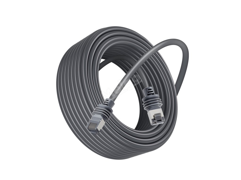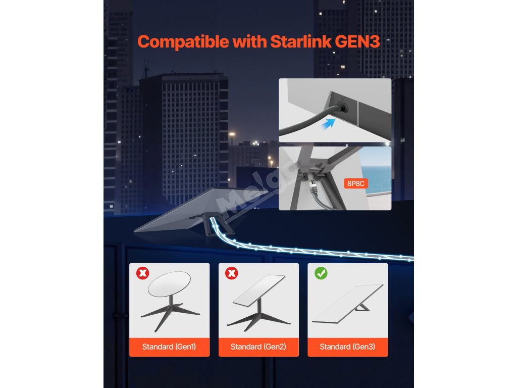 Tento kabel Starlink je určen pro obdélníkový standard V3. Díky konektoru 8P8C nevyžaduje žádné úpravy. Má měděné jádro 24 AWG a kovové stínění a podporuje rychlosti až 1200 Mb/s. Jeho odolný PVC plášť je ideální pro vedení na dlouhé vzdálenosti a použití na zahradách, v obytných vozech, na střechách, v kempech.