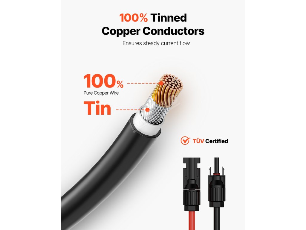 Cínovaná měď vede elektrickou energii účinněji než běžná měď, což znamená menší ztráty energie v průběhu času. Díky nižšímu odporu tento prodlužovací kabel pro solární panely zvyšuje celkovou účinnost vašeho systému a udržuje více solární energie tam, kam patří - na napájení vašich zařízení!