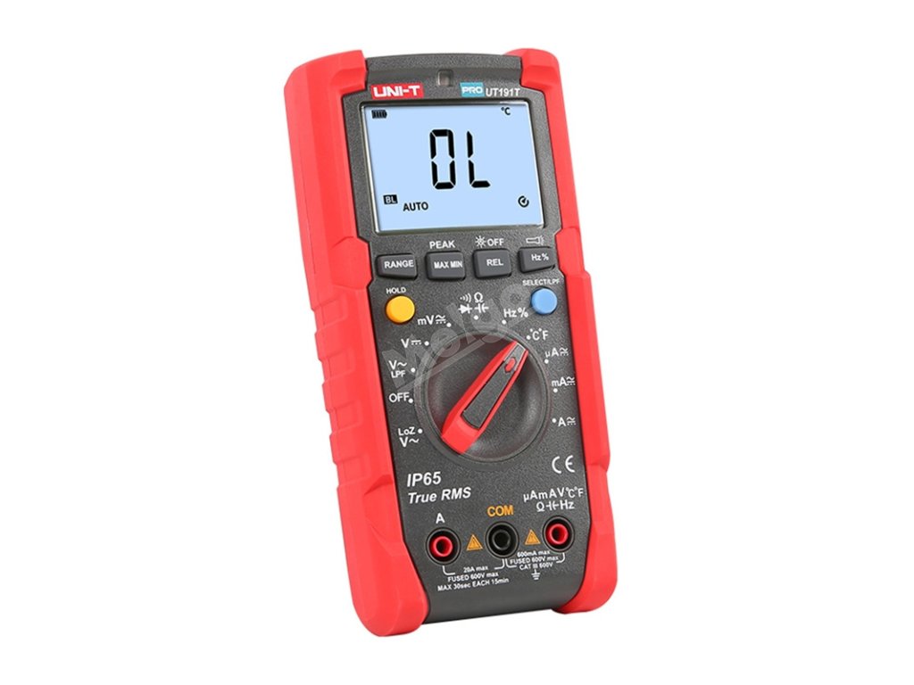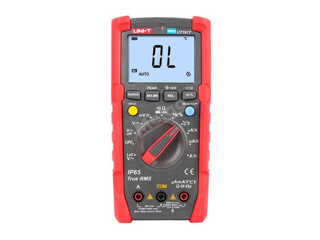UNI-T UT191T je profesionální digitální multimetr určený pro použití v náročných průmyslových podmínkách. Měřič je vybaven funkcí True RMS a poskytuje přesná měření napětí, proudu, odporu, kapacity, frekvence a teploty. UT191T nabízí rozlišení 6 000 počtů a automatickou nebo manuální volbu rozsahu. Kryt měřiče s krytím IP65 odolá pádu z výšky až 2 m, takže je ideální pro použití v náročných a proměnlivých podmínkách.