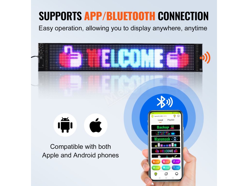Ovládá se připojením k aplikaci přes Bluetooth a podporuje připojení k více displejům LED najednou, takže váš obchod bude poutavější. Podporuje rolování textu, dat, časů, obrázků a videí, čímž přitahuje pozornost kolemjdoucích barevnými, dynamickými textovými displeji.