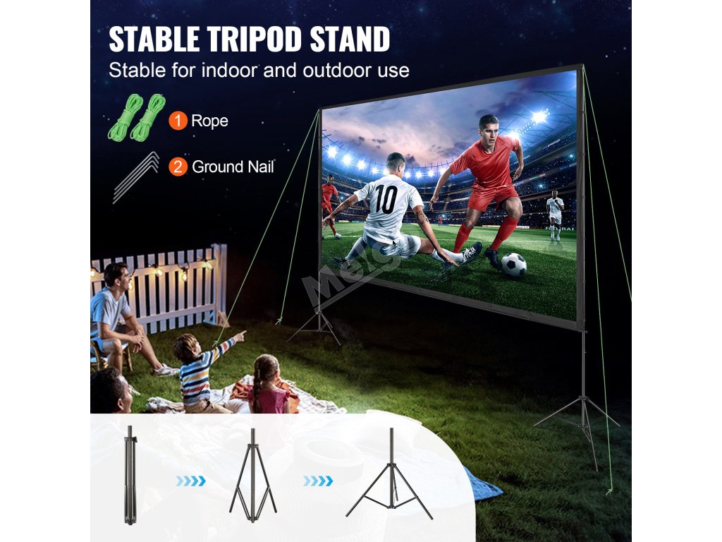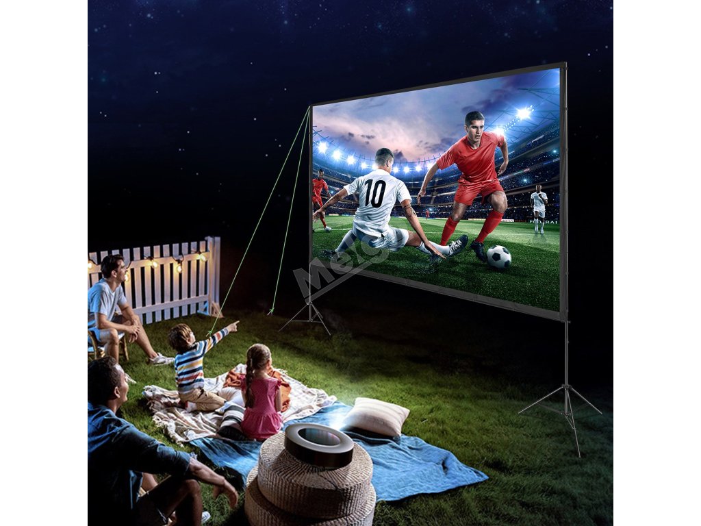 Naše venkovní filmové plátno se stojanem, které je navrženo s ohledem na stabilitu a vybaveno kolečky a lany pro bezpečné upevnění, zajišťuje jasné a stabilní zobrazení, ať už pořádáte akci v interiéru, nebo si užíváte promítání venku.