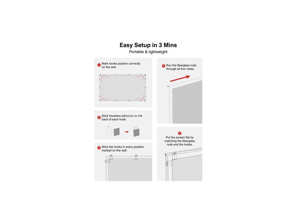 ZástěryULTIMEA E-ALR nabízejí dvě možnosti instalace. Připevněte ji na zeď pomocí háčků nebo lepidla, abyste ji řádně napnuli, nebo ji srolujte pro kempování a bez námahy ji zavěste pomocí šňůr.