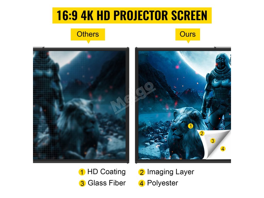 Díky vizuální kvalitě 4K HD a poměru stran 16:9 vám toto přenosné plátno v kině přinese pohlcující zážitek. Kromě toho je plátno vyrobeno z prvotřídních polyesterových vláken, která jsou odolná proti smršťování a snadno se čistí.