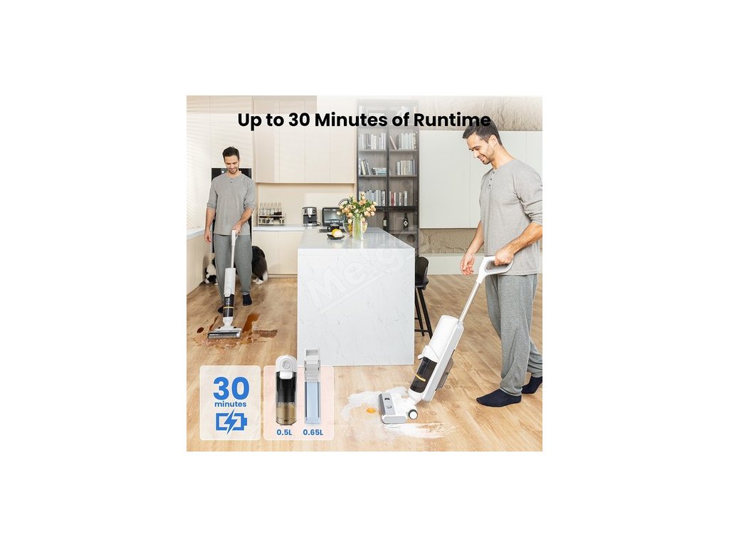 F10 Pro je vybaven baterií s kapacitou 6x2 600 mAh a na jedno nabití vydrží až 30 minut provozu. Nádrž na čistou vodu o objemu 650 ml a nádrž na špinavou vodu o objemu 500 ml umožňují nepřetržitý úklid až 970 metrů čtverečních.