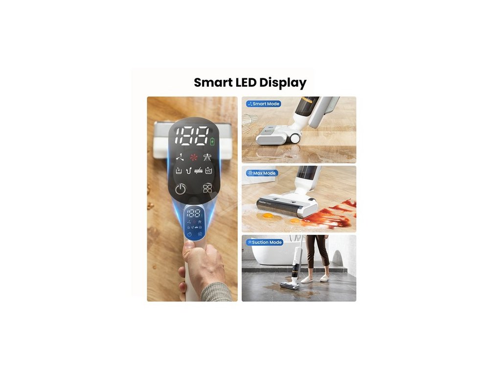 LED displej poskytuje aktuální informace o životnosti baterie, režimu čištění a upozornění na údržbu. Přátelské hlasové pokyny vás provedou celým procesem čištění a usnadní tak používání každému bez ohledu na věk.