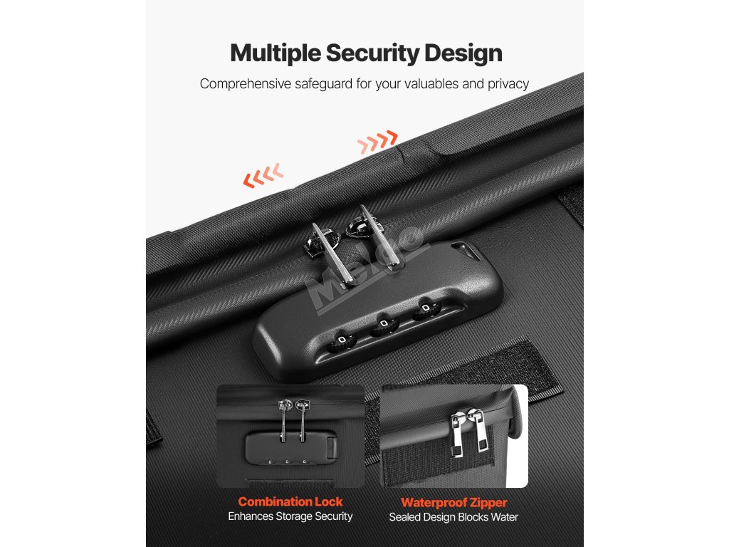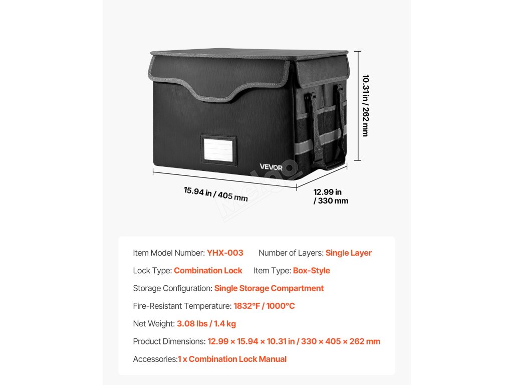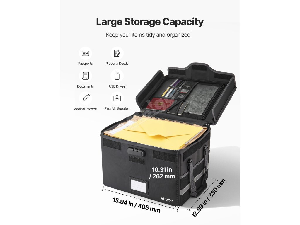 Tato ohnivzdorná skříňka odolává tlaku 1832℉/1000 ℃ a chrání před vodou a prachem. Váží 3,08 lbs/1,4 kg a umožňuje uspořádat soubory a vybavení pomocí vrstveného úložného prostoru. Vylepšený kombinační zámek a vodotěsný zip zvyšují bezpečnost cenností doma, v kanceláři nebo na cestách.