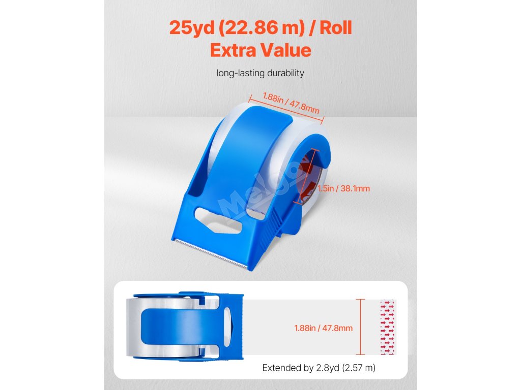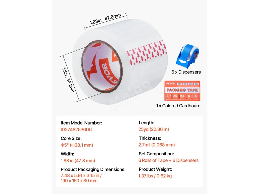 Naše cenově výhodná sada průhledné balicí pásky obsahuje 6 rolí 1,5" pásky s jádrem, každá o délce 25yd / 22,86m. To je o 2,8yd / 2,57m delší než typické pásky, což vám poskytne trvanlivější a cenově dostupnější řešení pro vaše balicí úkoly.
