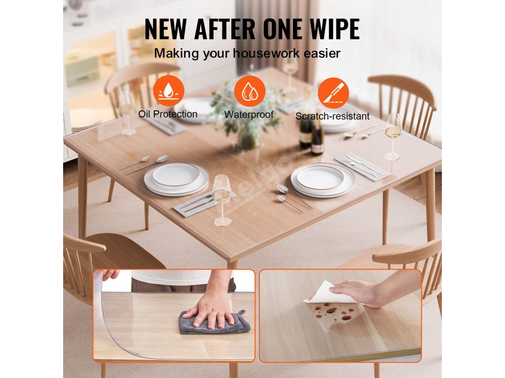Průhledný chránič stolu je vyroben z vysoce kvalitního PVC materiálu, je odolný proti opotřebení, poskytuje vynikající odolnost proti uklouznutí a odolává vysokým teplotám. Můžete je bezpečně používat přímo s potravinami. Užijte si bezproblémový a čistý pracovní stůl!