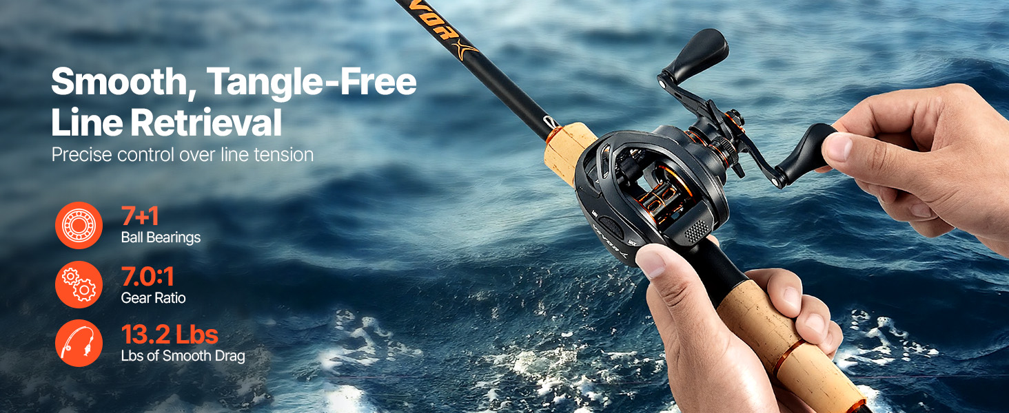 Díky 7+1 kuličkovým ložiskům a převodovému poměru 7,0:1 zajišťuje tento rybářský prut a naviják plynulé a účinné navíjení vlasce bez přerušení. Brzdná síla 13,2 lbs/6 kg umožňuje přesnou kontrolu napnutí vlasce, což usnadňuje manipulaci s intenzivně bojujícími rybami a snadné navíjení háčku.