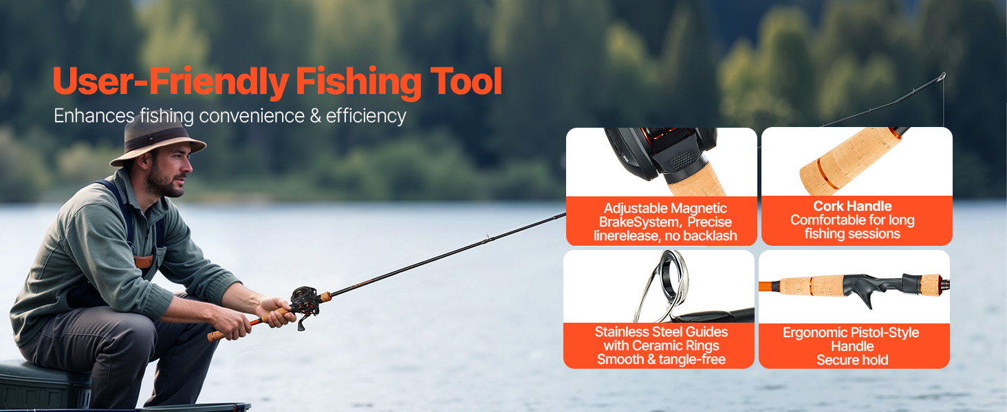Tato rybářská sada je vybavena nastavitelným magnetickým systémem brzdy pro přesné uvolnění vlasce, který snižuje zpětný ráz. Korková rukojeť poskytuje pohodlné, neklouzavé držení i při dlouhodobém používání, zatímco keramické kroužkové vedení minimalizuje tření vlasce a zabraňuje jeho zamotávání, čímž zajišťuje hladký a efektivní provoz.